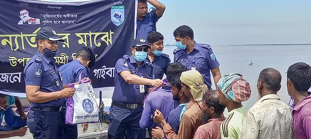গাইবান্ধার চরে পানি বন্দি মানুষের মাঝে শুকনো খাবার বিতরণ করলেন পুলিশ সুপার